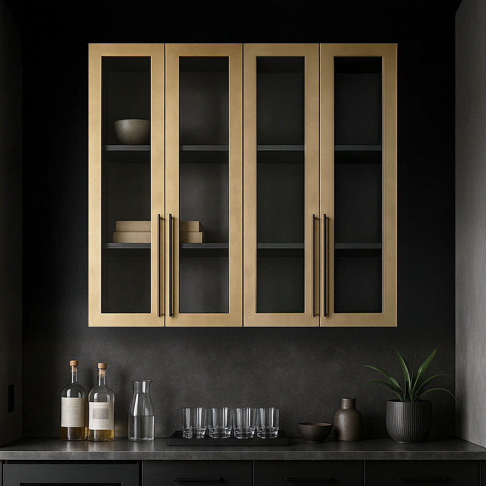 Our glass panel cabinet doors are a perfect solution to dress up your cabinets and still keep your bourbon collection on display. Customize hinge and pull locations, along with stile and rail widths so they can work for any cabinet.